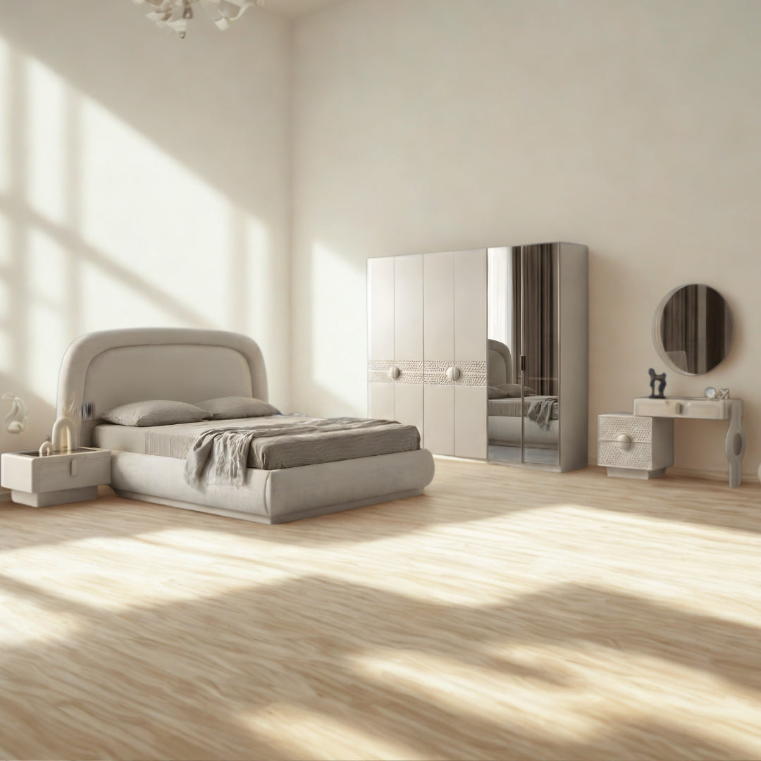 صُنعت مجموعة غرفة النوم هذه من مواد عالية الجودة وبنية داخلية متينة، وهي مصممة لتجمع بين المتانة والمظهر الأنيق. وتستخدم الخشب الهندسي مع تشطيب أنيق ومناسب للأثاث، وهو ما يُفضل عادةً في أثاث غرف النوم، كما تم تعزيزها بخشب رقائقي إندونيسي لمزيد من المتانة والثبات على المدى الطويل. ويساعد هذا المزيج على إضفاء مظهر راقي وأداء يومي موثوق به، بالإضافة إلى سطح سهل العناية يتناسب مع التصميمات الداخلية العصرية.